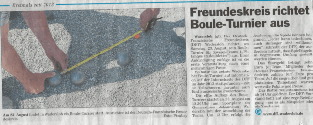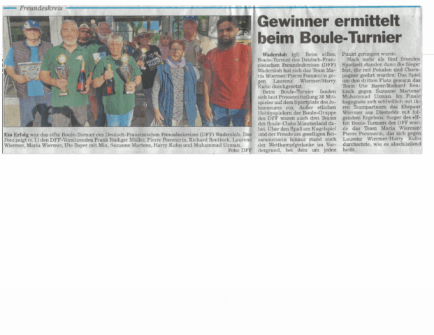 Turniere Hier finden Sie einige Bilder der Bouleturniere der Jahre 2001 – 2013 Bouleturnier 2025 Bouleturnier 2013 Bouleturnier 2011 Bouleturnier 2009 Bouleturnier im Herbst 2003 Bouleturnier im Herbst 2001